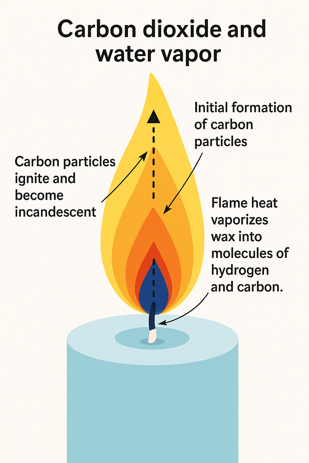 It takes a few minutes when you first light a candle for this combustion process to stabilize. The flame may flicker or smoke a bit at first, but once the process is stabilized, the flame will burn cleanly and steadily in a quiet teardrop shape, giving off carbon dioxide and water vapor.