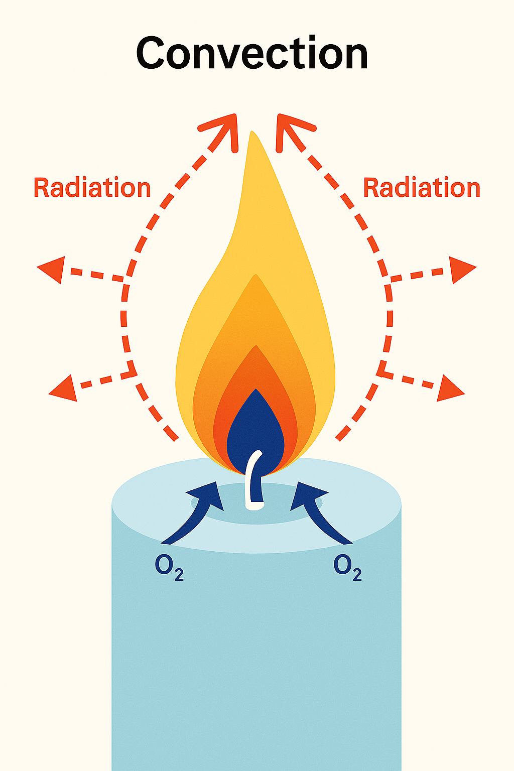 Approximately one-fourth of the energy created by a candle’s combustion is given off as heat radiates from the flame in all directions.